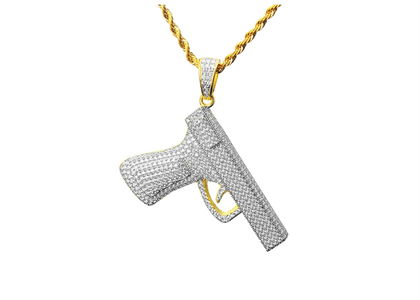 Plated in 14 KT Gold and lined with clear CZ stones, this Hip Hop Handgun Pendant recreates all the fine details of this iconic pistol
