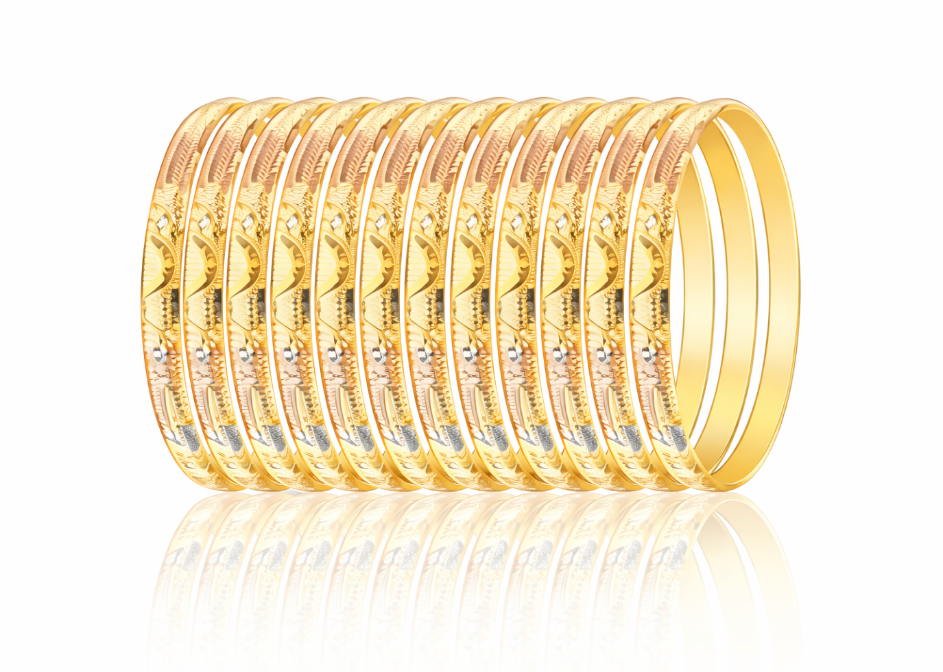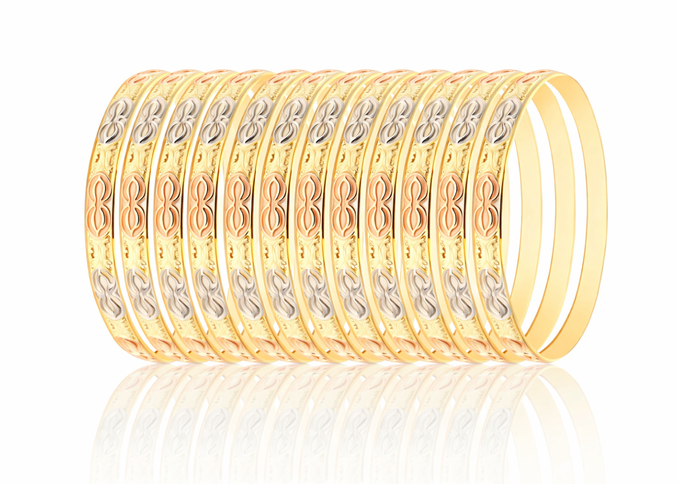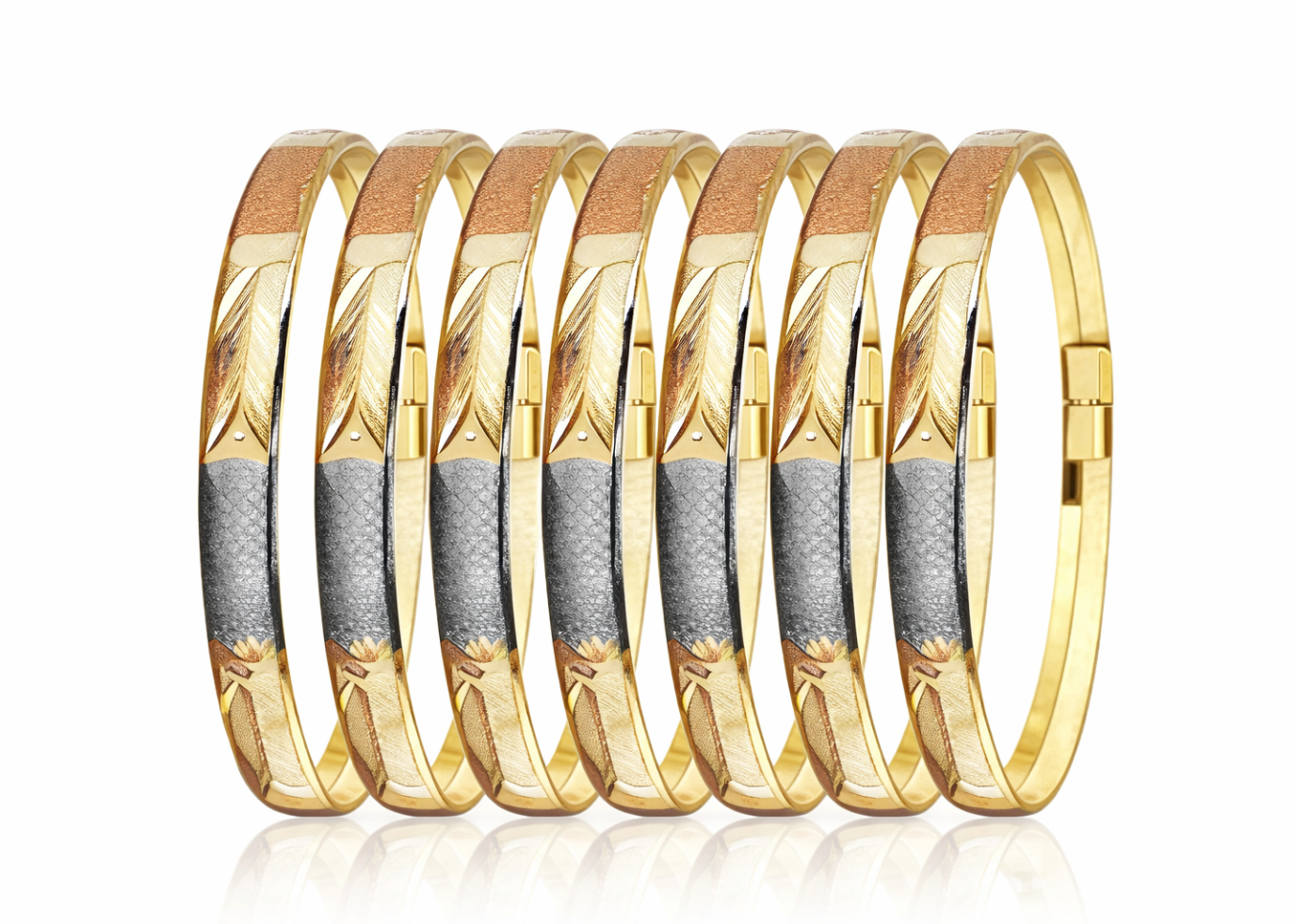Discover the elegance of 3 Tone Plated Machine Cut Bangles, crafted with precision technology to deliver a premium, high-shine finish. Designed with a stunning combination of gold, rose gold, and white gold tones, these bangles offer a luxurious multi-color appeal that complements both traditional and modern outfits. The advanced machine-cut detailing enhances brilliance, texture, and durability, making them perfect for daily wear, festive occasions, weddings, and gifting.