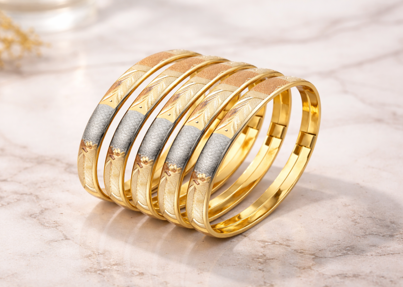 Three Tone Plated 6MM Bangles feature a stunning blend of gold, rose gold, and silver tones with a precision diamond-cut finish for extra sparkle. Designed for women who love elegant yet versatile jewelry, these 6MM bangles are lightweight, durable, and comfortable for daily wear, weddings, and festive occasions. Crafted with high-quality gold plating, they offer a premium look at an affordable price. Perfect as a gift for her or as a stylish addition to your traditional and modern jewelry collection.
