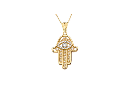 The ancient inspired Egyptian protection Gold Plated Evil Eye Hamsa Pendant hand studded with white CZ's stone to signify the eye