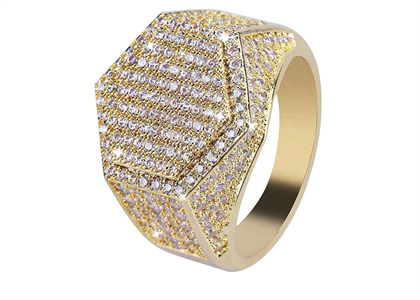 This Hexagon Micro Pave Ring is made from Gold Plated brass with 14 kt. Each stone is carefully set by hand by a professional jeweler, creating a totally iced out look