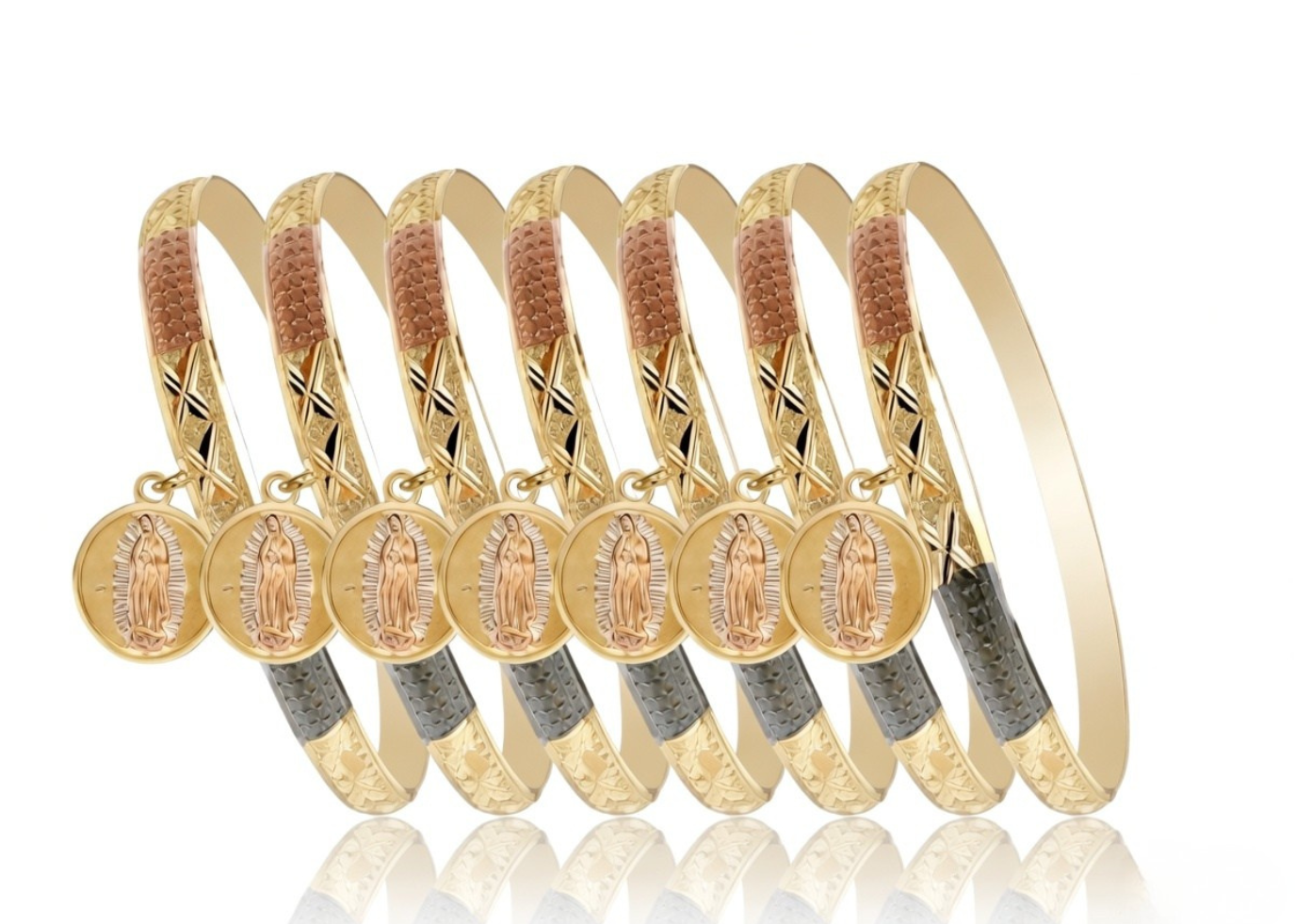 Mother Mary Charm Bangle with Three Tone Plating measuring 6 mm in width and 15 mm of Mother Mary Charm weighing approx 10.8 grams per piece with High Polish Finish