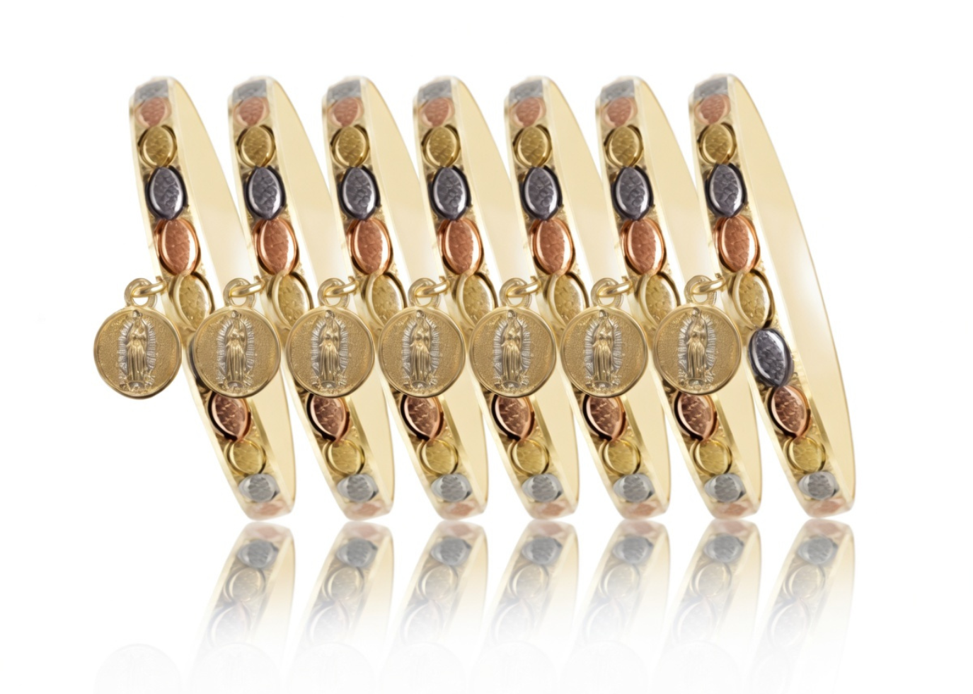 Mother Mary Charm Bangle with Three Tone Plating measuring 6 mm in width and 10 mm of Mother Mary Charm weighing approx 10.8 grams per piece with High Polish Finish