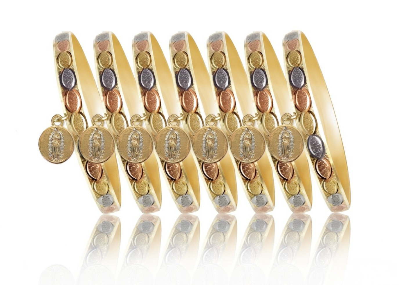 Mother Mary Charm Bangle with Three Tone Plating measuring 6 mm in width and 10 mm of Mother Mary Charm weighing approx 10.8 grams per piece with High Polish Finish