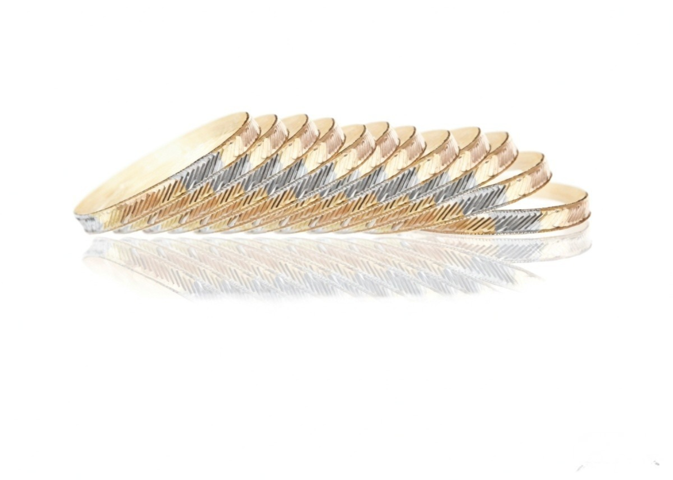 Three Tone Plated side veni Bangle of 6.5 mm 14 kt 3 Tone Gold Plated Bangle in ALL SIZE # 1 TO # 8 of Approx 14.58 grams with High Polish finish Sold as a set of 12 pc