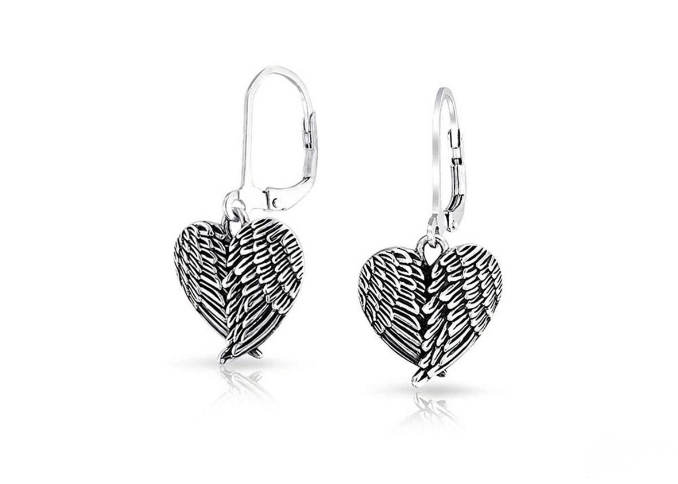 Created from 14kt Rhodium Plated with polished and oxidized contrasts, this Heart Shaped Angel Wings Earrings is stylish and chic and can be worn during the day or night.