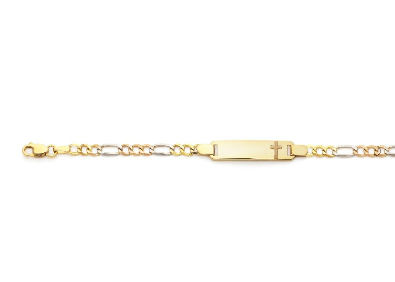Three Tone Plated Cross Figaro Chain ID Bracelet with 5 MM width, weighing approx 5.60 grams